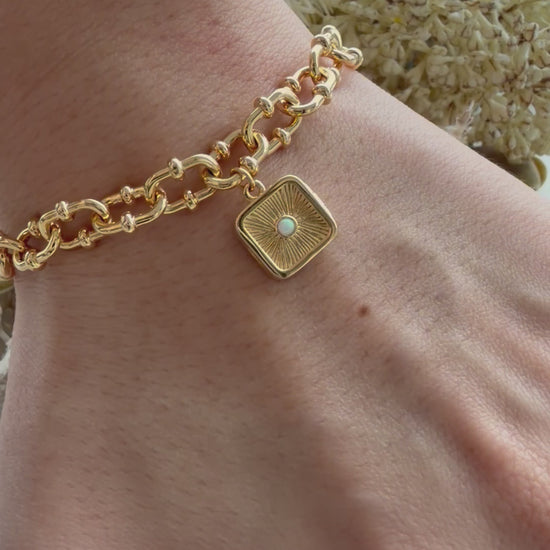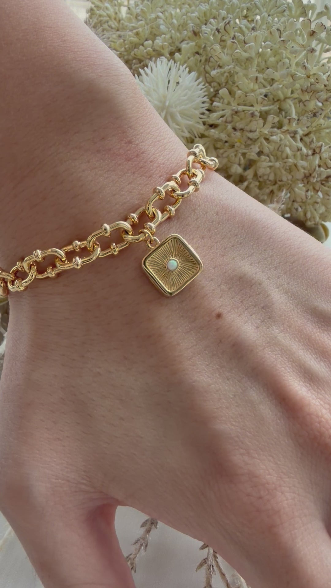 A statement piece with a touch of nostalgia — this design features a vintage-inspired chunky chain paired with a square locket adorned with an opal stone. The starburst motif mirrors the first light of dawn, symbolizing hope and radiant new beginnings.