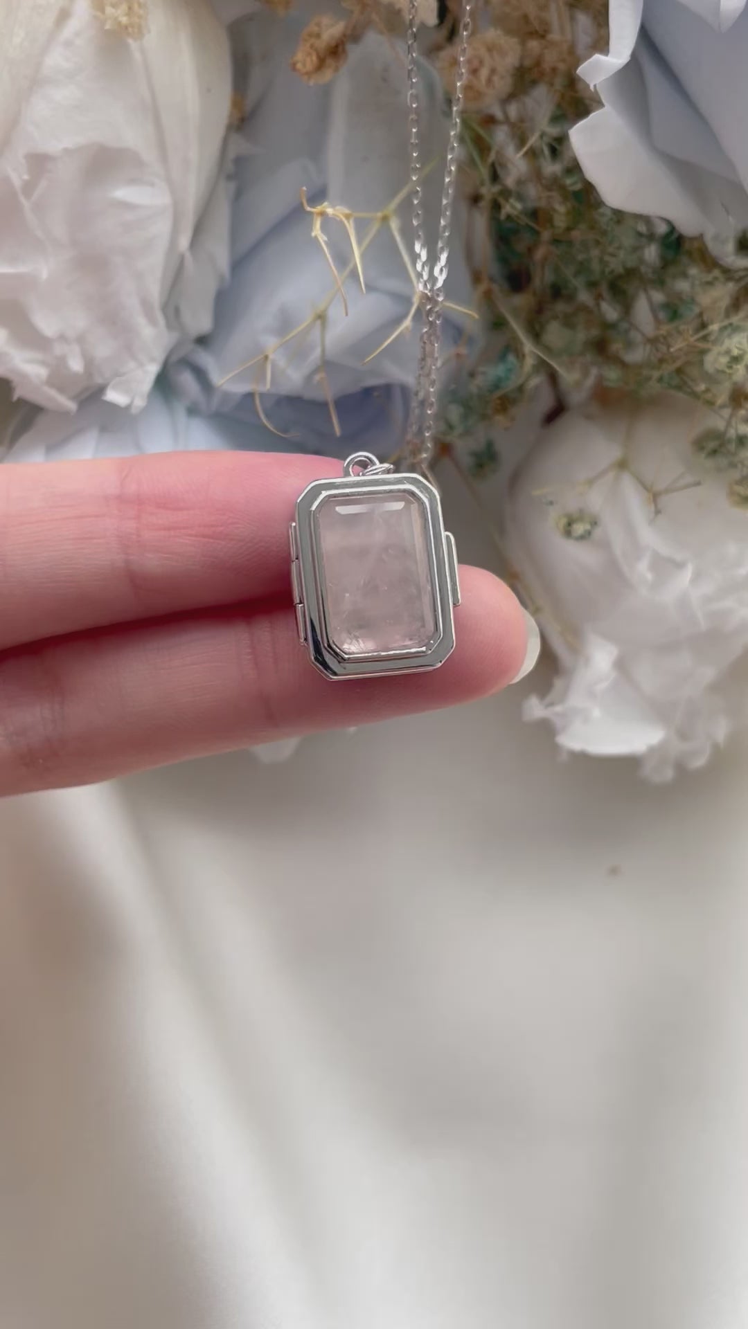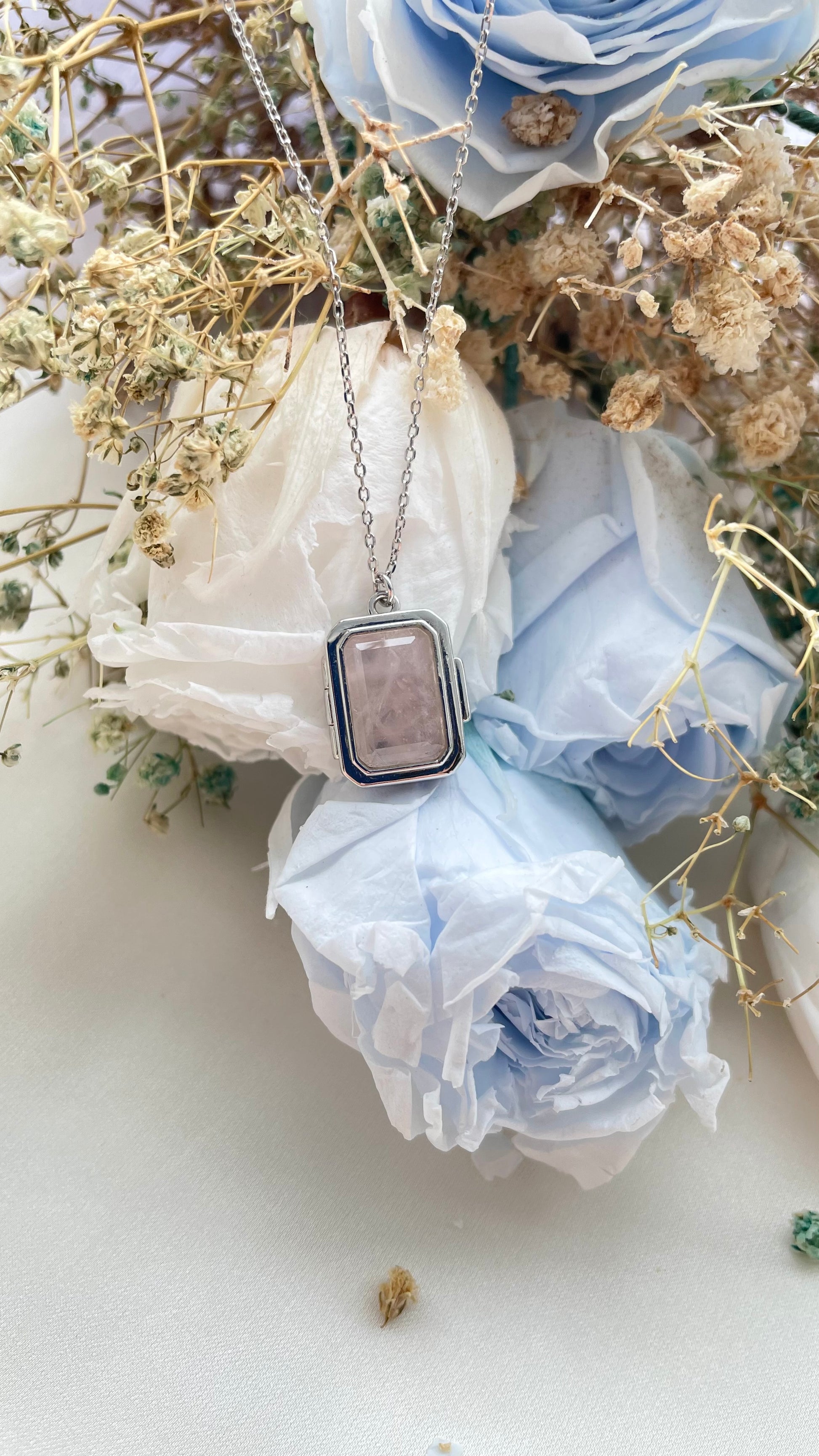 This elegant locket features a natural rose quartz gemstone, carefully shaped in a timeless emerald cut. Each stone is one-of-a-kind, with unique milky streaks that make every piece subtly different. The locket is paired with a delicate, adjustable cable chain, offering a customizable fit from 16 to 18 inches. A beautiful blend of natural beauty and delicate craftsmanship, perfect for adding a touch of sophistication to any look.